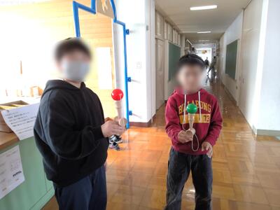 今、校内の各フロアにはけん玉が配置されています。中休みや昼休みにはあちこちで技を磨く子どもたちの姿が見られるようになりました。